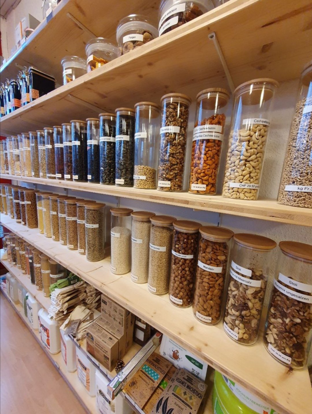 Wir bieten biologische, auch regionale Produkte unverpackt an. Der Kaffee von der Rösterei Hosennen www.hosennen-kaffee.ch in Gersau duftet beim Aufmachen des speziell gefertigten Kaffeebehälters. Dieser verhindert das Oxidieren der Bohnen. Auch das Irma Brot in ursprünglicher Rezeptur, langer Triebführung und auf Stein gebacken, ist der Hit! www.irmabrot.ch