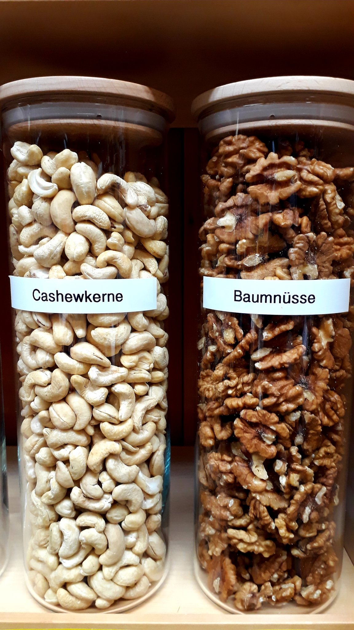 Wir haben uns für 2,1 Liter Gläser zur Aufbewahrung im Laden entschieden, damit die wertvollen Lebensmittel nur kurz dem Licht ausgesetzt sind. Somit können wir die Qualität der Produkte gewährleisten. Der Vorrat ist dunkel und trocken gelagert.