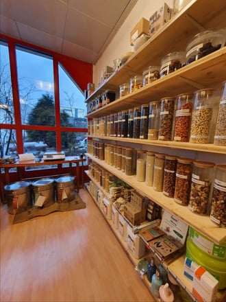 Körner und Flocken (z.T. aus Rickenbach ), verschiedene Müesli und eigenes Regenbogenmüesli, Hülsenfrüchte, Samen, Kerne, Nüsse, Dinkelkeimpasta und weitere Pasta, Vollkorncouscous, Salz, Gemüsebrühe, Chai Tee und Gummibären ohne Gelatine.